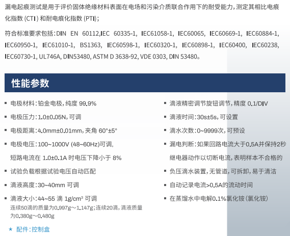 漏電起痕測試是用于評價(jià)固體絕緣材料表面在電場和污染介質(zhì)聯(lián)合作用下